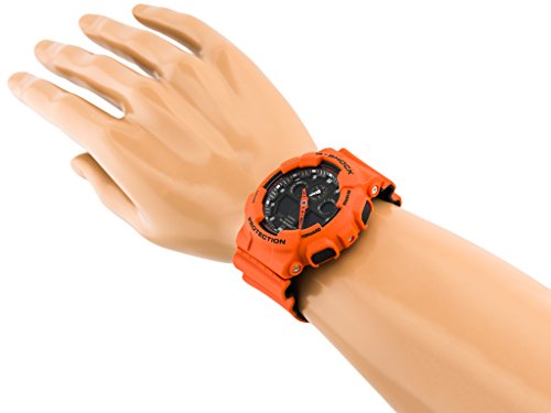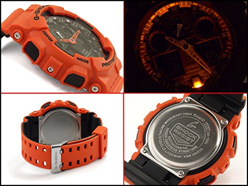 -. Feature : CASIO G-SHOCK watch GA-100L-4AER, 55 mm resin case with mineral dial window and case-back closed by screws, black dial with analog display and digital subdials for calendar, orange resin strap with steel buckle closure, 20 BAR of water resistance classification, weight: 72 gr. Function: world time function, stopwatch function - 1/100 sec. - 1 hour, Timer - 1/1 sec. - 100 min, 5 daily alarms. Brand new and delivered with manufacturer warranty and genuine CASIO presentation box.