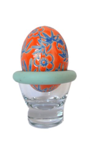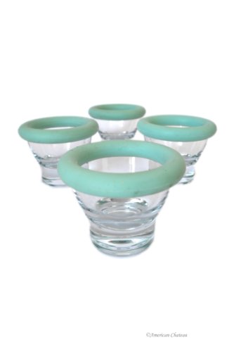-. Feature : Set of 4 Egg Cups / Clear Glass with Removable Cyan Silicone Rim / Glass is Dishwasher/Microwave Safe / Approximate Dimensions: 2.25" x 2"