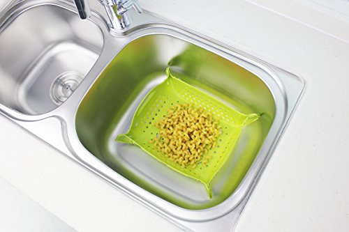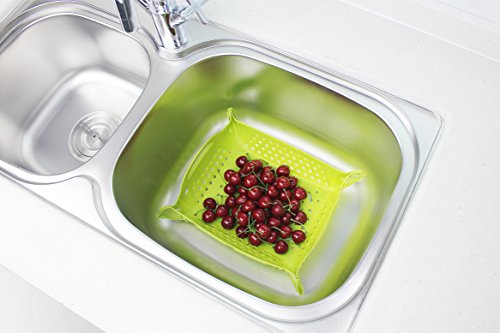 Foldable colander mat for the kitchen sink. Also designed to be used as fruit basket, trivet mat, dish drying mat, spoon rest. Heat-resistant up to 400°F/ 200°C.