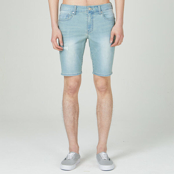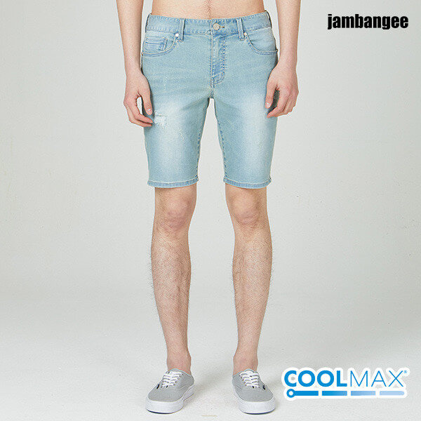 흡습성이 뛰어나 땀을 빨리 배출시켜 시원함을 느낄 수 있는 쿨맥스 소재로 그레이쉬한 LB톤 바이오 스톤 캣브러쉬 오픈구제 워싱의 남성용 4부 데님 스타일.