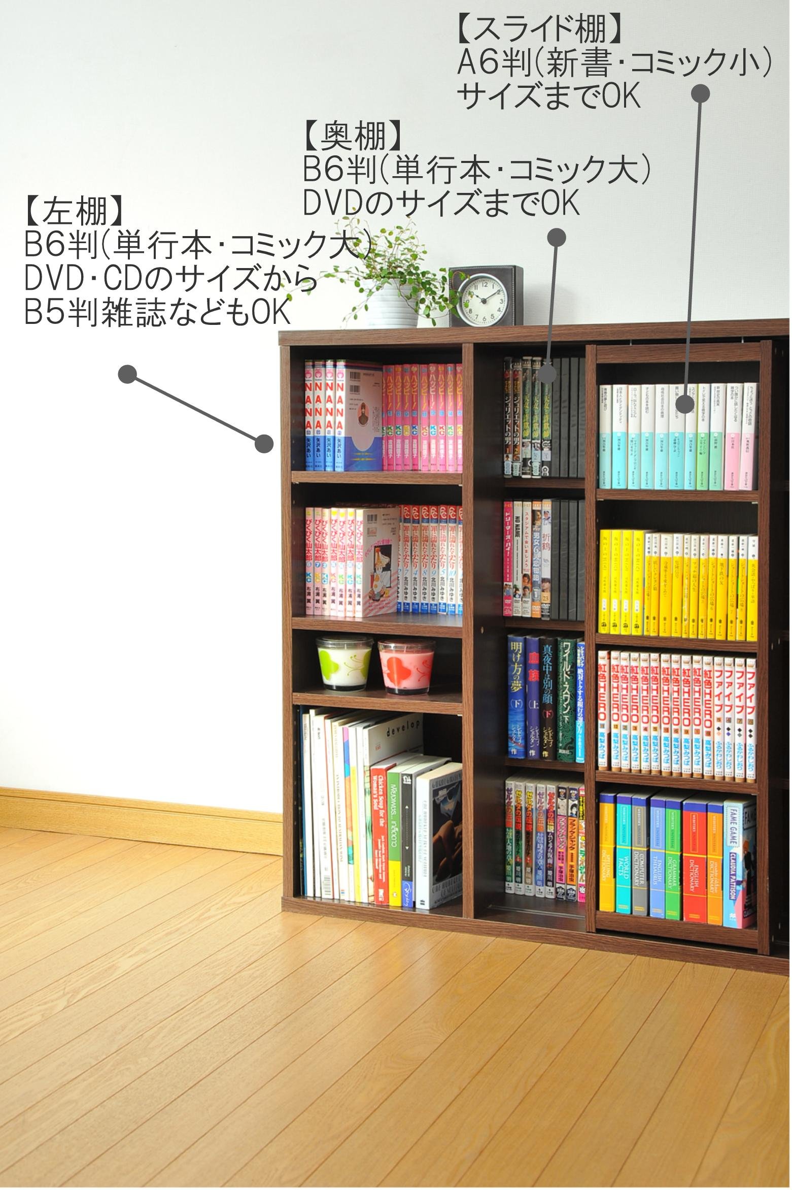 There is a right rear shelf behind the slide shelf, and moving the slide shelves left and right makes it easy to see the back book at a glance and take out and put in.