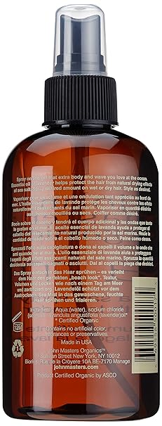 Contains natural sea salt to add extra body for a beach look & feel Formulated with certified-organic lavender to shield hair from drying Hair appears volumized & texturized Safe for color-treated hair To use: After shampooing & conditioning spray onto hair & leave in.