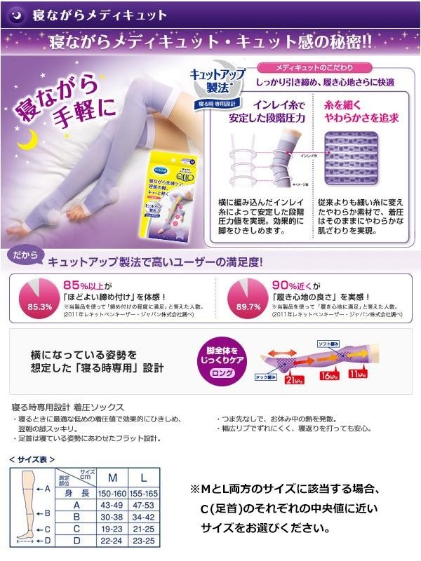 安定した段階圧力値を実現するキュットアップ製法で、しっかり引き締め履き心地快適。ひざ上丈のロングタイプで足全体をじっくりケア。つま先なしでお休み中の熱を発散し、上部口ゴムは幅広リブでズレ落ちにくい。 |