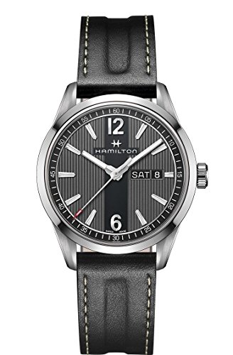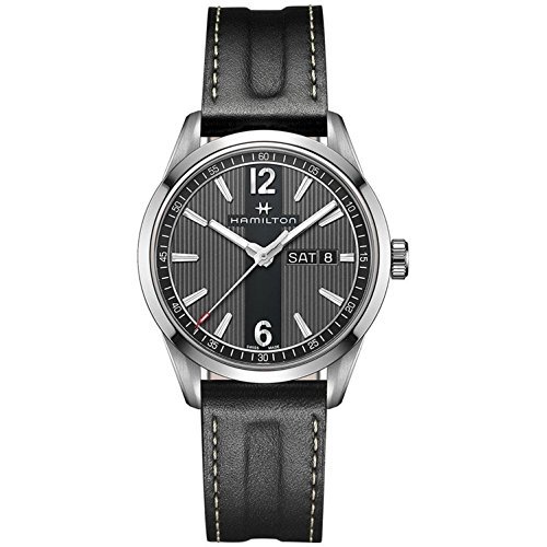 Studio : Hamilton Publisher : Hamilton Binding : Watch Product Description This stylish timepiece from Hamilton's Broadway collection has been adapted for men with a busy city life and a taste for style. While the caseback sports a design reminiscent of New York drain covers, the dial features tall, straight lines that seemingly extend upwards past the dial, calling to mind the towering skyscrapers of the City. For a user-friendly display, the dial features a day-date window at 3 o'clock and a red-tipped seconds hand. A sapphire crystal and 50 meter water resistance protect the dial and Swiss quartz movement within. - Hamilton Broadway Collection