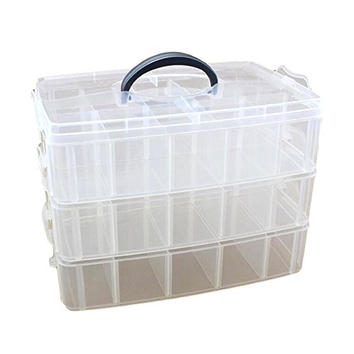 -. Feature : Material: durable hard plastic. / 3-tiers Large Overall Size: L 24 x W 16 x H 19cm Size of Grid: L 8 x W 6 x D 5cm / 30 grids clear hard plastic storage box organizer, simple and practical. / Perfect for storing earrings, rings, beads ,pill,medicine and other mini goods. Removable dividers: The grid inside the box can be moved, so you can adjust the dividers to create your own size compartments. / It can be used to store earrings, necklace, bead, finger ring or other small jewelry and small drugs