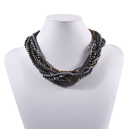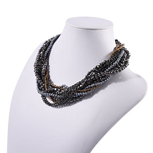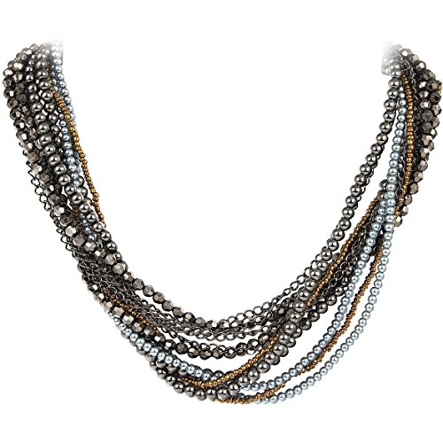 Make a bold statement. Multiple strands of grey, bronze, and dusky pearls entwine with gunmetal grey chains and beads for a fashionable and bold look.