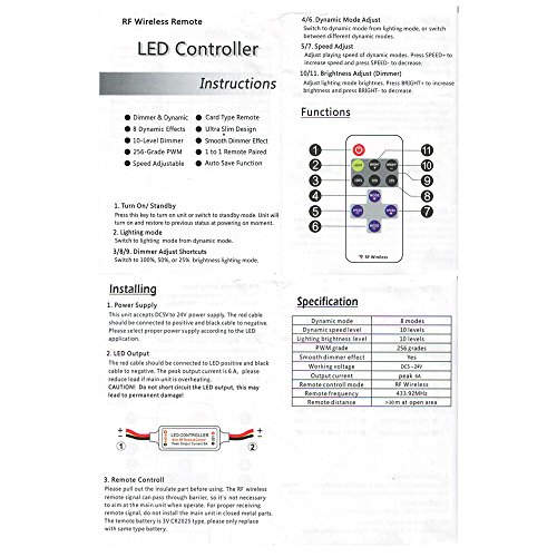 PACKAGE INCLUDES: 1 LED light string, 1 DC 12V power adapter (US plug), 1 RF remote controller & receiver. ***8 dynamic modes, 10 level dimmer.***