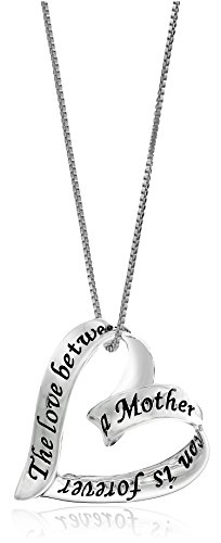 Sterling silver necklace featuring curled ribbon heart pendant with engraved message "The Love Between A Mother and Son Is Forever"
