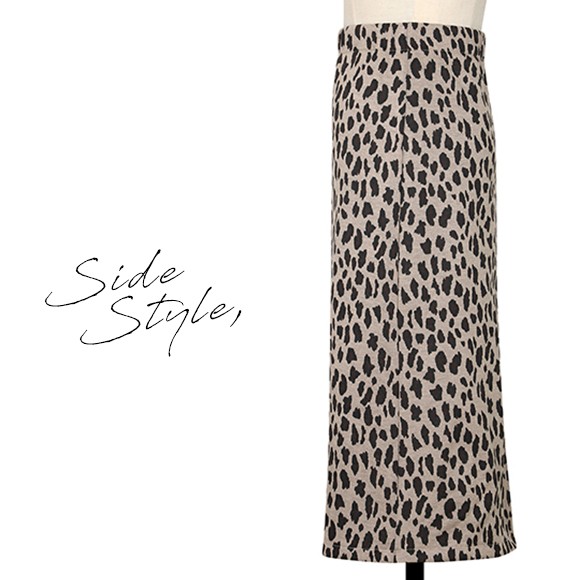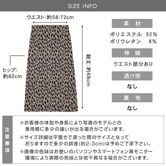 ◆商品紹介◆トレンドのレオパード柄のタイトスカートです。すっきりとしたスリムなシルエットで、女性らしく着て頂けます。 オーバーサイズのスウェットやニットと合わせても、タイトなトップスと合わせても相性抜群です。落ち着いた色味と長めの丈感で、挑戦しやすいヒョウ柄アイテムです。◆素材感・サイズ感◆柔らかい素材感[素 材]ポリエステル92% ポリウレタン8%[伸 縮]ウエスト部分あり[透け感]なし[裏 地]なし◆モデル◆・身長156cm・フリーサイズ着用(対応可のサイズS-M) ※お客様の体型や身長により写真のモデルとの着用感に多少の違いが出る場合がございます。◆サイズ◆※サイズ詳細は平置きで測った際のサイズとなっておりますので多少の誤差(約2-3cm)は予めご了承下さい。 スカート丈:68cm ウエスト:58-72cm ヒップ:82-90cm ※画像の色味はお使いのパソコンやスマートフォン等モニター環境により実際の色味とは若干異なる場合がございます。