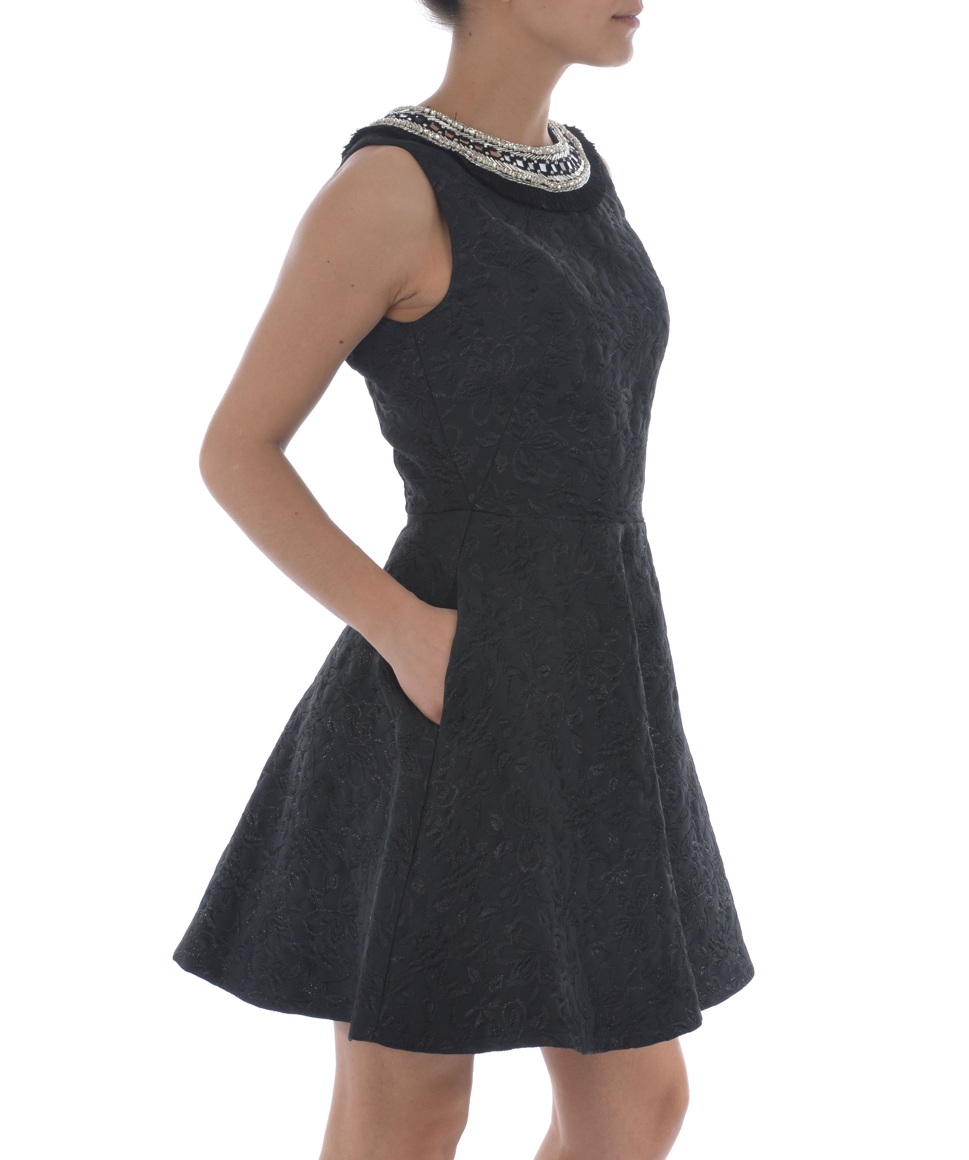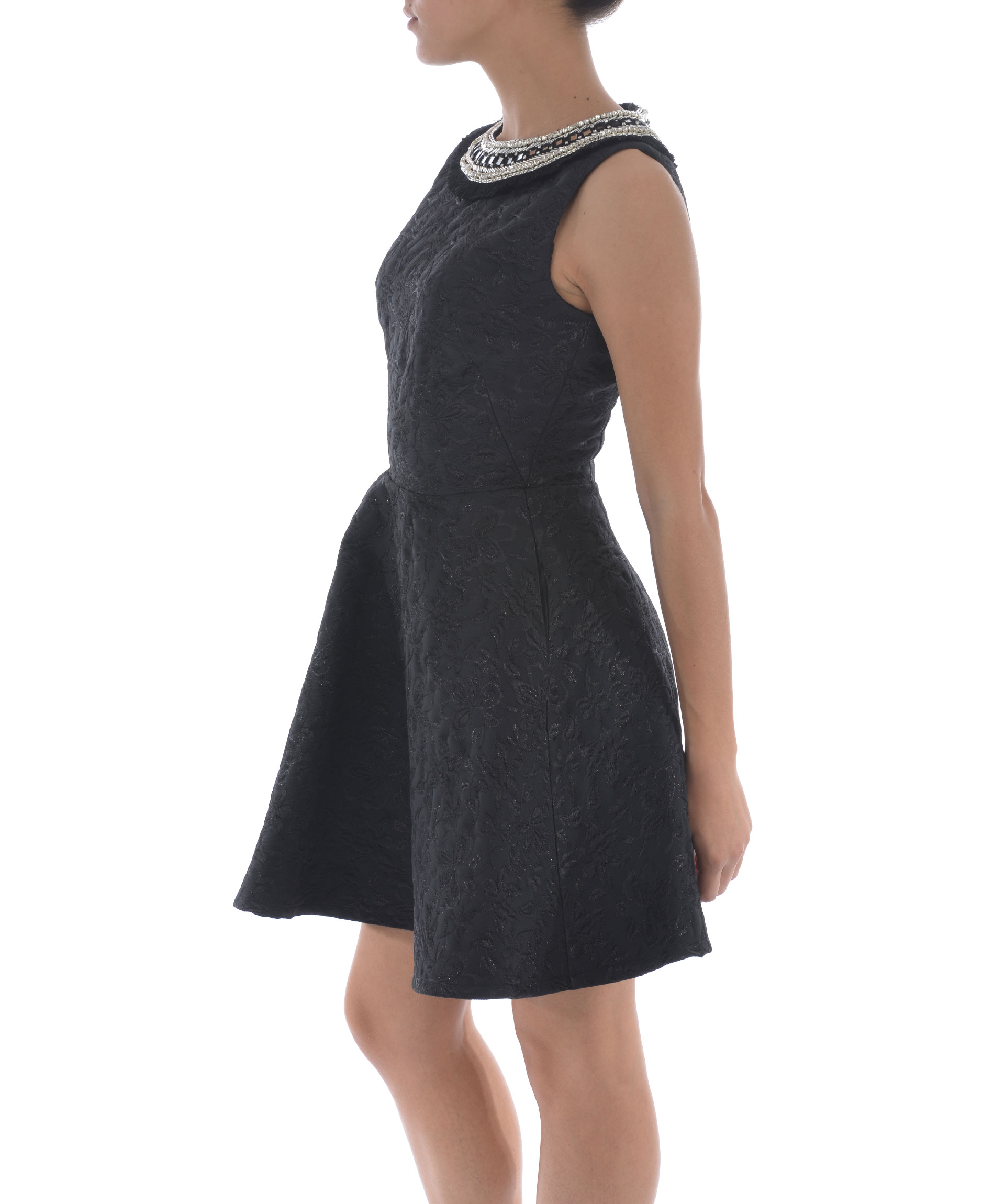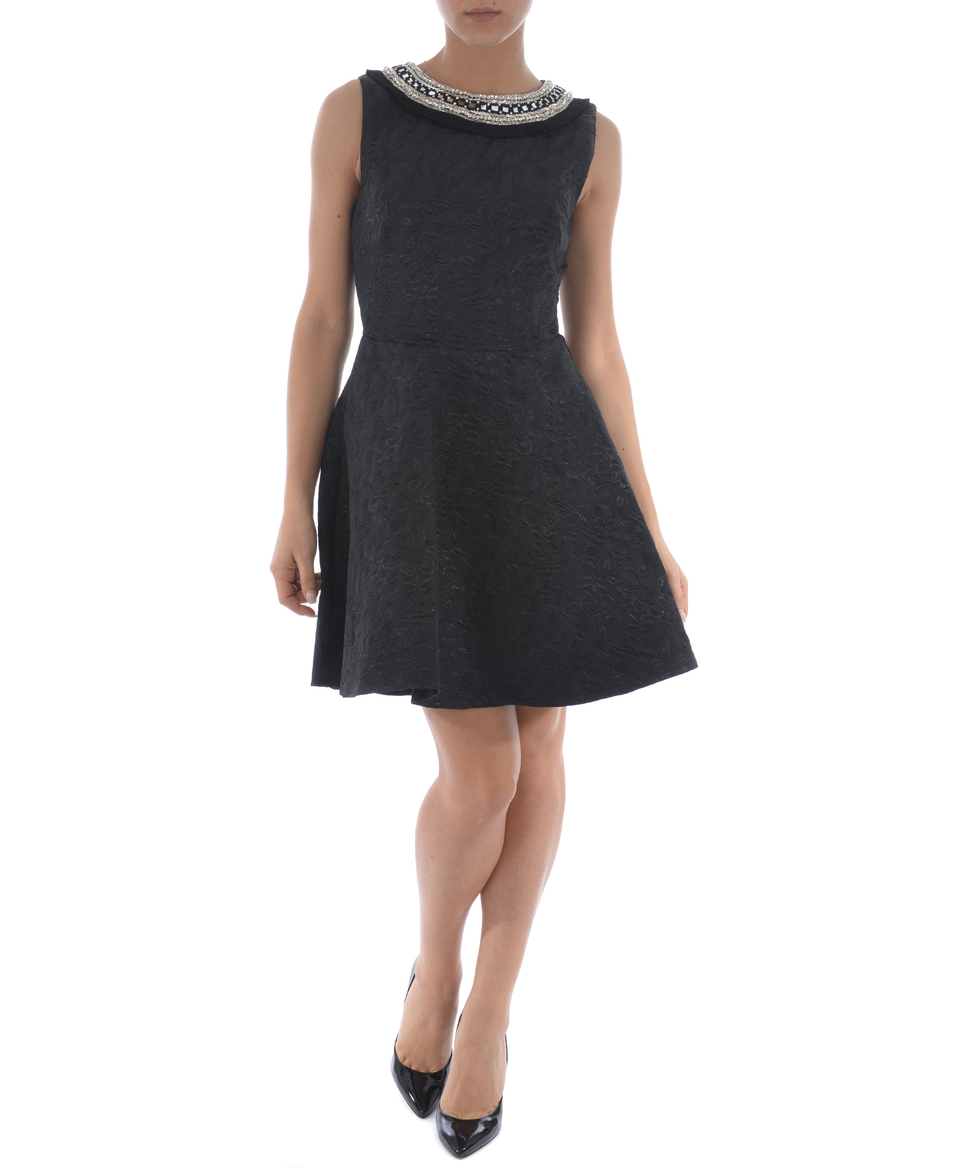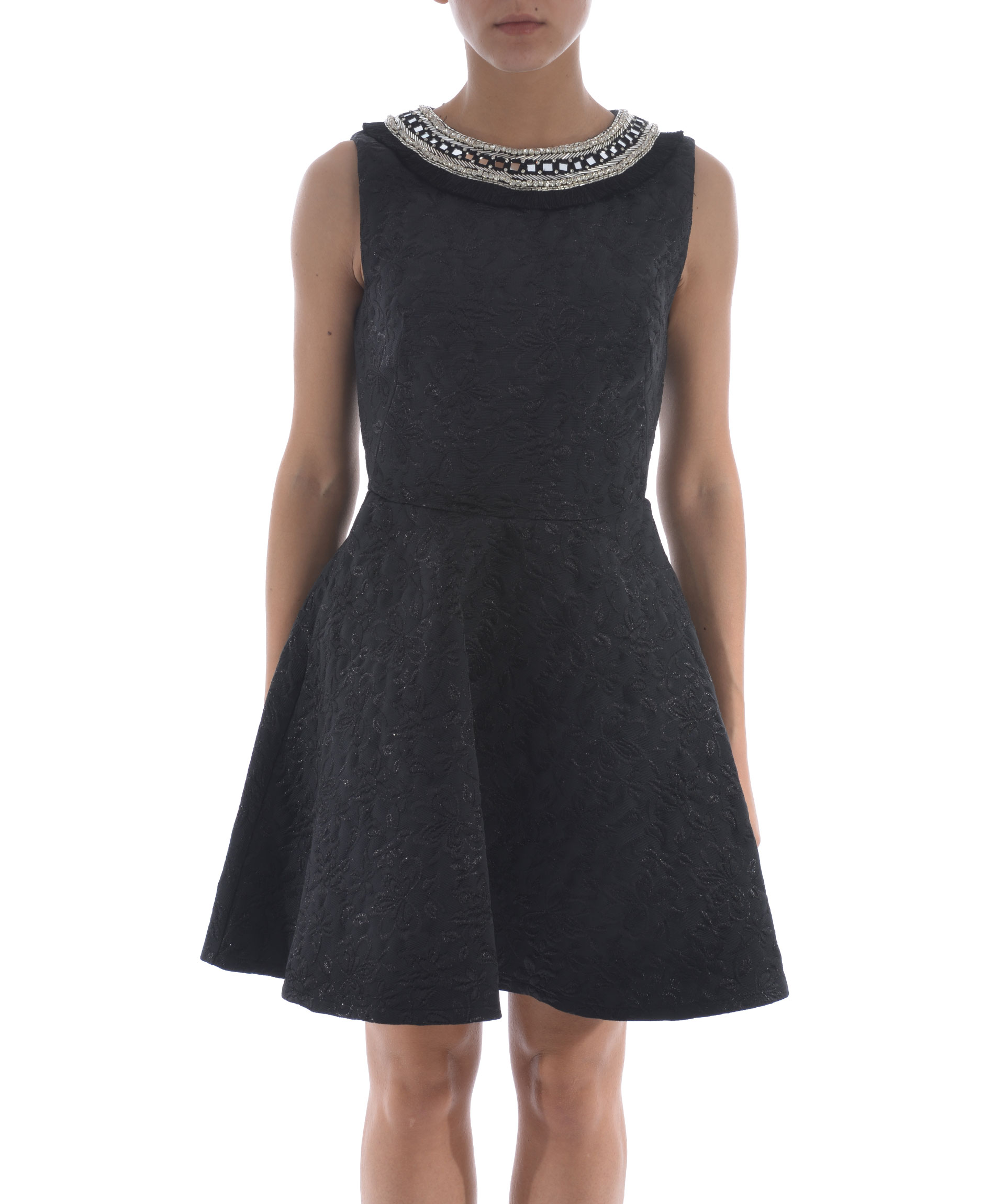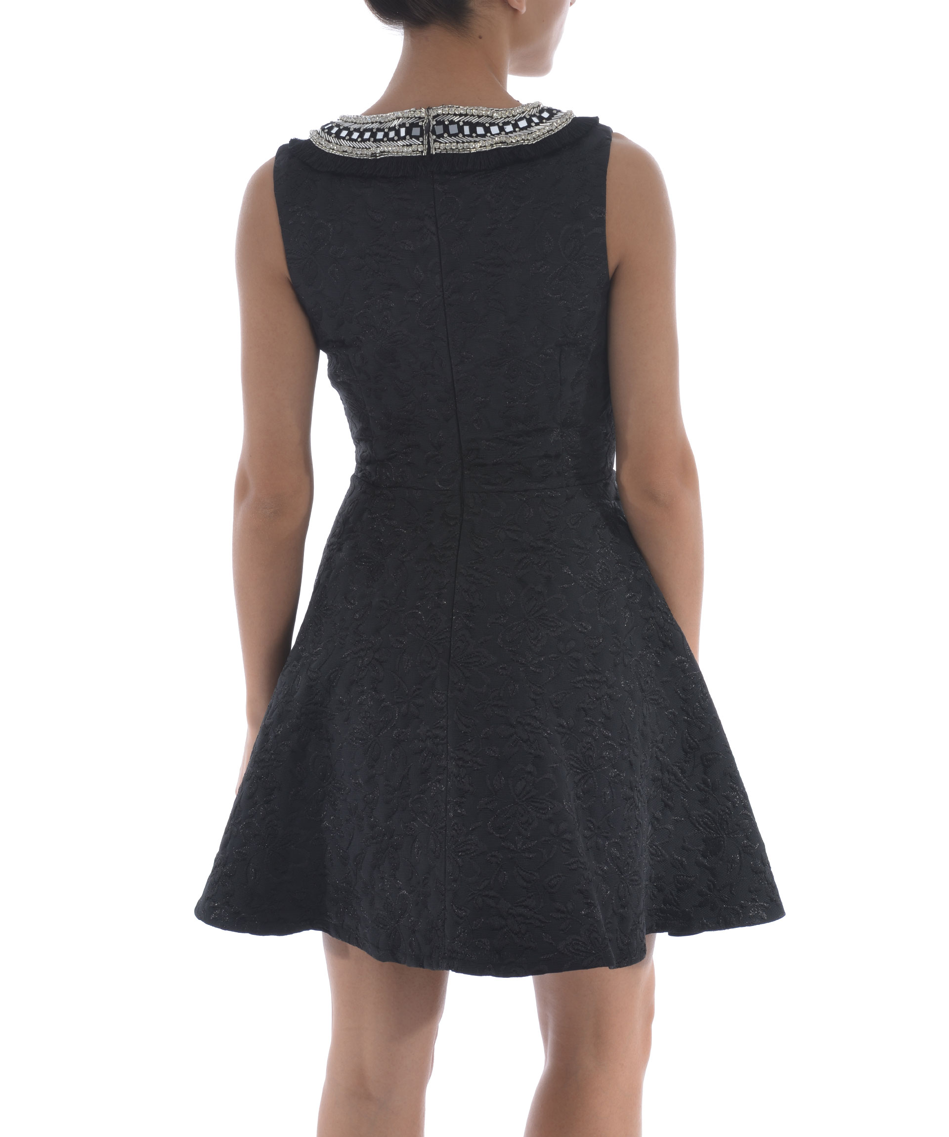 Flared Dress from Amen: Black Flared Dress with round neck, sleeveless design, embellished detail at neckline and back zip closure.