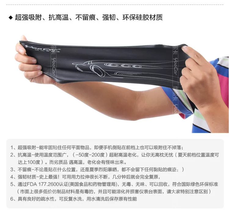 This product has the bumps in the car window to "catch" live a mobile phone. You can put it in the car, fix your mobile phone, GPS navigator,clock, pen, perfume, access cards, coins, tissue boxes, bottles and other items; you can also use it to your home or office all kinds of remote control, mp3/mp4, iPod, mirror, comb, a small electronic device.Preparation and other frequently to find small things fixed to a wall or you want to keep it in place. In addition, it also has the clean function, you can take it to remove dust, such as the keyboard, screen and otherequipment, after washing with water does not reduce its viscosity.Viscous unique, its viscosity from the innovative siloxane synthesis andspecial formulation, make its surface can form a little micro suction cups,it can firmly suck any flat object and can be easily removed, but do not leave any marks on the adherend, the soft and smooth texture can bring you the baby skin feeling, it is difficult to imagine how widely use!