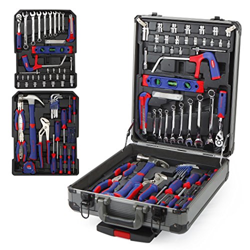 - Feature : Ratchet handles are ergonomically designed and have an easy-to-use, thumb-operated reverse-switch mechanism, quick released operation / Chrome vanadium forged body for torque, strength and durability / Full polish chrome finish for anti-corrosion protection / Most daily use tools, includes hammer, level, tape measure, hex key, sockets, pliers, saws, snap-off knifes screw driver handle and bits / Lockable aluminum tool trolley with large size durable castor