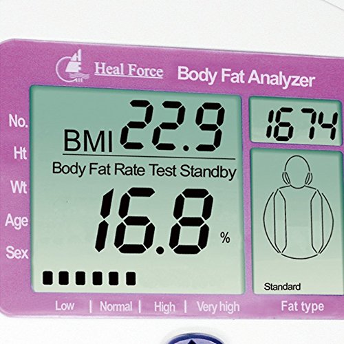 -. Brand : HealForce -. EAN : 0750810593482 -. Feature : P.R.Ince 120 is designed to calculate the Body Fat Rate by body's resistance impedance and approP.R.Iate parameters like height, weight, age and sex / Stores up to 9 individual profile settings so the whole family can track their progress / Displays readings quickly in about 7 seconds / Packing Dimensions: 270mm*190mm*65mm / Net Weight: 260g -. IsAdultProduct : 0 -. Label : Heal Force -. Manufacturer : Heal Force -. MPN : ZGY0519 -. PackageQuantity : 1 -. PartNumber : ZGY0519 -. ProductGroup : Health and Beauty -. ProductTypeName : PERSONAL_CARE_APPLIANCE -. Publisher : Heal Force -. Studio : Heal Force -. Title : Heal Force Fat Loss Monitor Body Fat Analyzer -. UPC : 750810593482