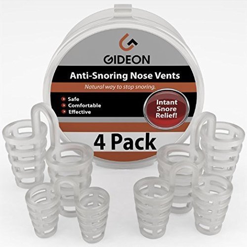 Studio : Gideon Publisher : Gideon Binding : Health and Beauty Product Description Gideon Anti-Snoring Nose Vents - Natural and Instant Snore Relief - Pack of 4 When we are asleep, our muscles narrow as the muscles become relaxed, and may even sometimes close off temporarily. The air passing through this smaller opening can cause the tissues surrounding the opening to vibrate, which in turn can cause the sounds of snoring. The Gideon Anti-Snoring Nose Vent keeps the nostrils open, thus maximizing the airflow in the nasal passageways, effectively eliminating the snoring sounds. The Gideon Anti-Snoring Nose Vents is a fast and simple solution to effectively stop snoring. It's comfortable and non-invasive, and best of all, its invisible. Get yourself a good night sleep; do it for yourself and for your sleeping partner. Package Includes: 4 Nose Vents - Small, Medium, Large, X-Large 1 Plastic Hygiene Case