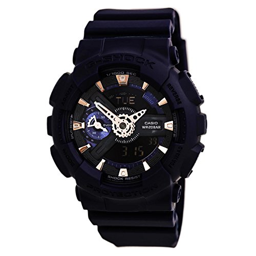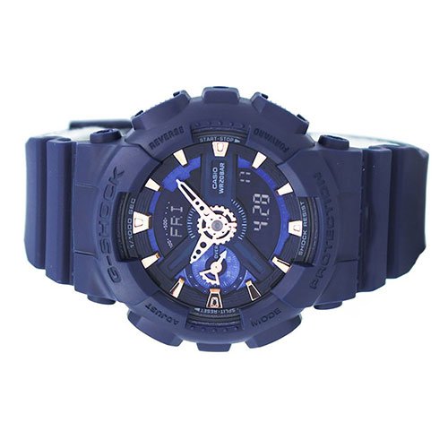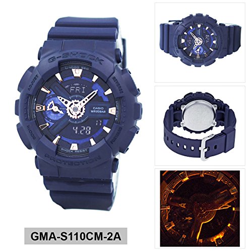 The watch is not only shock and magnetic resistant, but it also has stopwatch and countdown functions, as well as a speed indicator and world time options.Mineral GlassMagnetic ResistantShock Resistant200-meter water resistanceBlack dial with stick indices, three hands, subdial, digital displays and G-Shock logoResin case and bezelNavy Resin bandLED lightWorld timeCountdown timerQuartz movementCasio Style#: GMAS110CM-2A