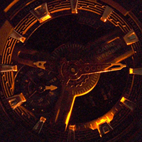 - Black dial with stick indices, three hands, subdial, digital displays and G-Shock logo