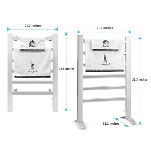 Dimension (Freestanding): 35.3 x 21.7 x 13.2 inches; Dimension (Wall-mounted): 33.5 x 21.7 inches. Material: Aluminum. Input voltage: 110 -120V. Power consumption: 105 Watts. Note: Actual temperature will depend on the surrounding temperature & humidity