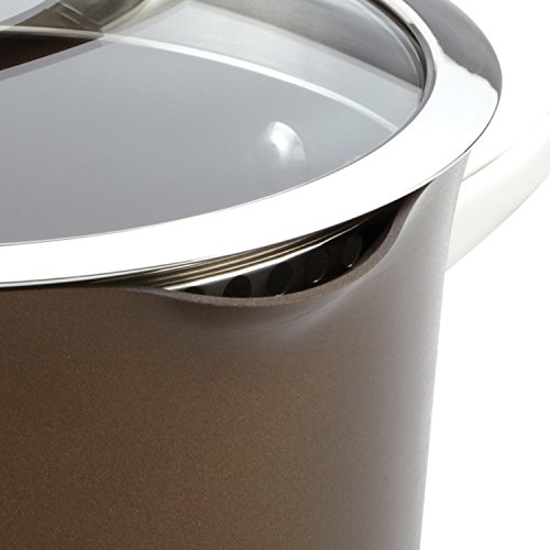 Hard-anodized aluminum construction; impact-bonded stainless steel base is suitable for all stovetops; elegant tulip shape and rich chocolate exterior