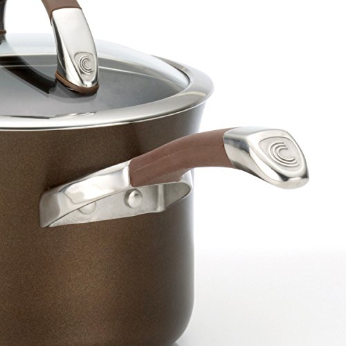 Versatile and good-looking Circulon Symmetry Chocolate cookware combines richly-colored exteriors in an elegant tulip shape with durable heavy-duty hard-anodized construction for fast, even heating. This Circulon Symmetry Chocolate Hard-Anodized Nonstick 3-1/2 Quart Straining Saucepan features a clever lid design with a deep rim and straining holes, for straining, pouring or covered cooking. Constructed of durable heavy-duty hard-anodized aluminum, the saucepan is fitted with an impact bonded stainless steel base suitable for all stovetops, including induction. Line the straining lid holes up with the pan's convenient pour spouts and strain liquids off with ease, or rotate the lid and use it as a covered saucepan. The TOTAL Food Release System of raised circles with top-quality DuPont Autograph nonstick both inside and out helps to reduce surface abrasion and delivers extraordinary food release and easy cleanup - and it's metal utensil safe. The graceful, cast stainless steel handle is enhanced with silicone to provide a confident grip. This cookware is dishwasher safe and oven safe up to 400 DegreeF. Prepare healthy blanched vegetables, light, delicious pasta portions and other foods without strain with the Circulon Symmetry Chocolate Hard-Anodized Nonstick 3-1/2 Quart Straining Saucepan, including a Lifetime Limited Warranty.Feature