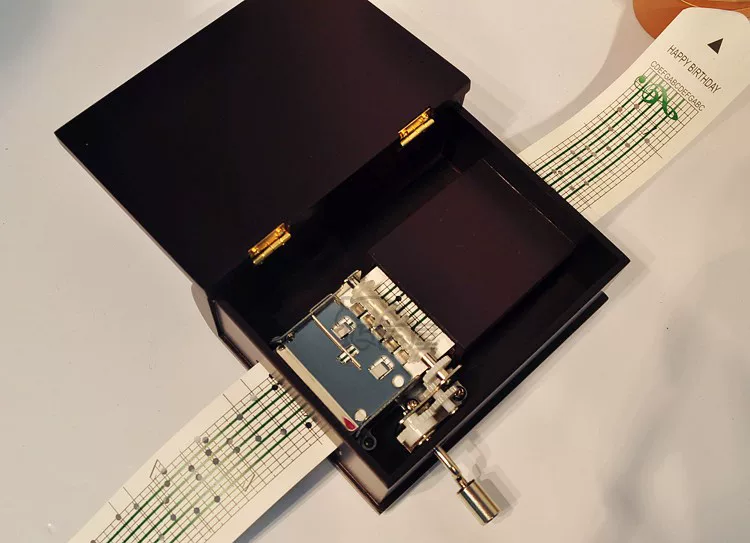 纸带放入音乐盒入口 手摇手柄 就可以听到美妙的音乐