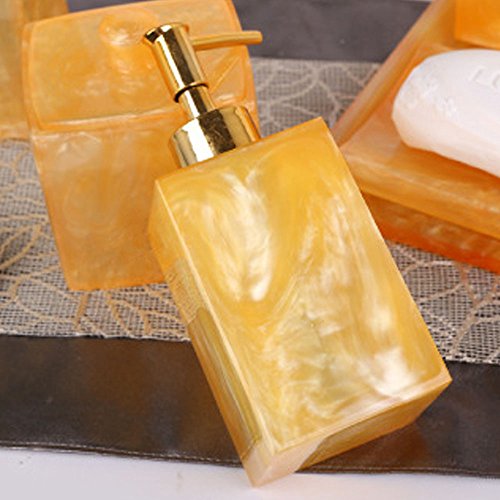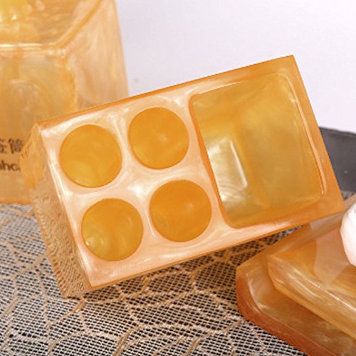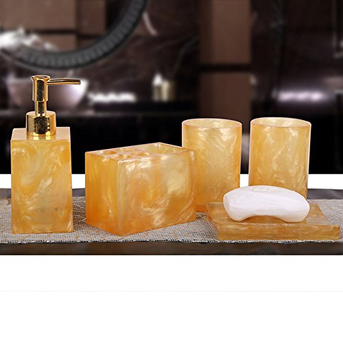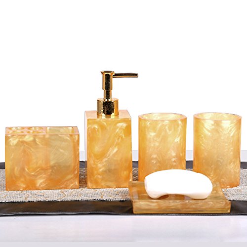 Contemporary deluxe ceramic 5 piece bathroom accessory set includes 1 round soap dish, 1 lotion/soap pump dispenser, 1 toothbrush holder (holds up to 4 toothbrushes), and 2 tumbler.