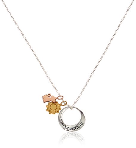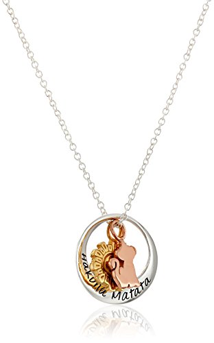 -. Binding : Jewelry -. Brand : Disney -. Color : Silver -. Department : womens -. EAN : 0845105201156 -. Feature : Sterling silver necklace featuring open-circle pendant with "Hakuna Matata" inscription and two charms suspended at center / Charms feature rose gold-plated Simba and gold-plated sun designs / SP.R.Ing-ring clasp / Imported -. Label : Disney Jewelry -. Manufacturer : Disney Jewelry -. Model : D40109 -. MPN : D40109 -. PackageQuantity : 1 -. PartNumber : D40109 -. ProductGroup : Jewelry -. ProductTypeName : FASHIONNECKLACEBRACELETANKLET -. Publisher : Disney Jewelry -. Studio : Disney Jewelry -. Title : Disney Tri-Colored "Hakuna Matata" Simba and Sun Charm Circle Pendant Necklace, 18" -. UPC : 845105201156