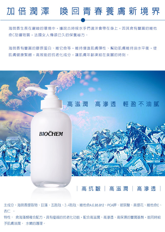 Contain seaweed compound formula with excellent antioxidant function to maintain the young skin. Combined with high moisturizing, high penetration, and high moisture maintenance base, the product replenishes oil and water at the same time.