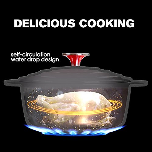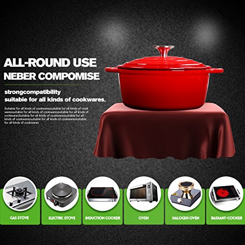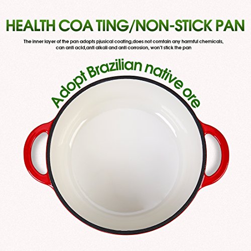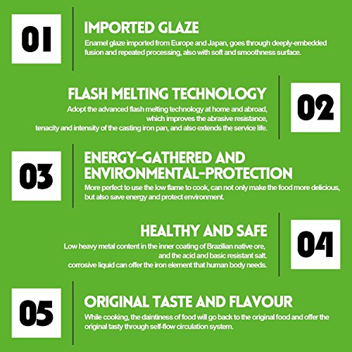 Product Description ★IMPORTED GLAZE: Enamel glaze imported from Europe and Japan, goes through deeply-embedded fusion and repeated processing, also with soft and smoothness surface. ★FLASH MELTING TECHNOLOGY: Adopt the advanced flash melting technology at home and abroad, which improves the abrasive resistance, tenacity and intensity of the casting iron Dutch Oven, and also extends the service life. ★ENERGY-GATHERED AND ENVIRONMENTAL-PROTECTION: More perfect to use the low flame to cook, can not only make the food more delicious, but also save energy and protect environment. ★HEALTHY AND SAFE: Low heavy metal content in the inner coating of Brazilian native ore, and the acid and basic resistant salt, corrosive liquid can offer the iron element that human body needs. ★ORIGINAL TASTE AND FLAVOUR: While cooking, the daintiness of food will go back to the original food and offer the original tasty through self-flow circulation system. 0