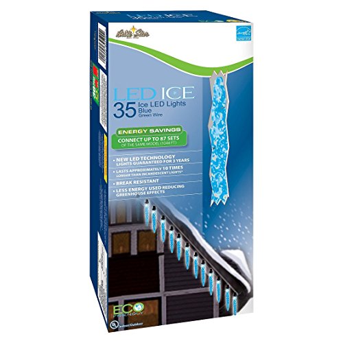-. Binding : Tools & Home Improvement -. Brand : Brite Star -. Color : No -. Feature : 35 lights per string on green wire. LED lights are blue / Each acrylic icicle is 4.5 inches long. / UL listed for Indoor and Outdoor Use, Energy Saving LED Technology / Connect up to 87 sets end to end / Guaranteed for 3 years by manufacturer, lasts 10 times longer than incandescent lighting -. Label : Brite Star -. Manufacturer : Brite Star -. Model : 39-590-00 -. MPN : 39-590-00 -. NumberOfItems : 1 -. PackageQuantity : 1 -. PartNumber : 39-590-00 -. ProductGroup : Home Improvement -. ProductTypeName : HOME_LIGHTING_ACCESSORY -. Publisher : Brite Star -. Studio : Brite Star -. Title : 35 Light Blue Icicle Shaped LED Light Set -. Warranty : Manufacturer's replacement guarantee - light set is pre-tested in the factory and date coded. It is intended for seasonal use and only if installed according to enclosed directions. Brite Star's three year guarantee covers repair or replacement of any light set that fails to light for three holiday seasons (90 days max per season). All claims must be filed no later than January 30th after the holiday season. If your light set fails to light, return it with proof of purchase to the address on the box.
