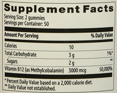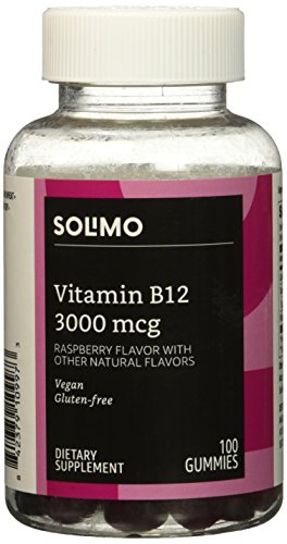 Solimo Vitamin B12 gummies feature raspberry flavor with other natural flavors. They're vegan and gluten-free. Adults - chew two daily.