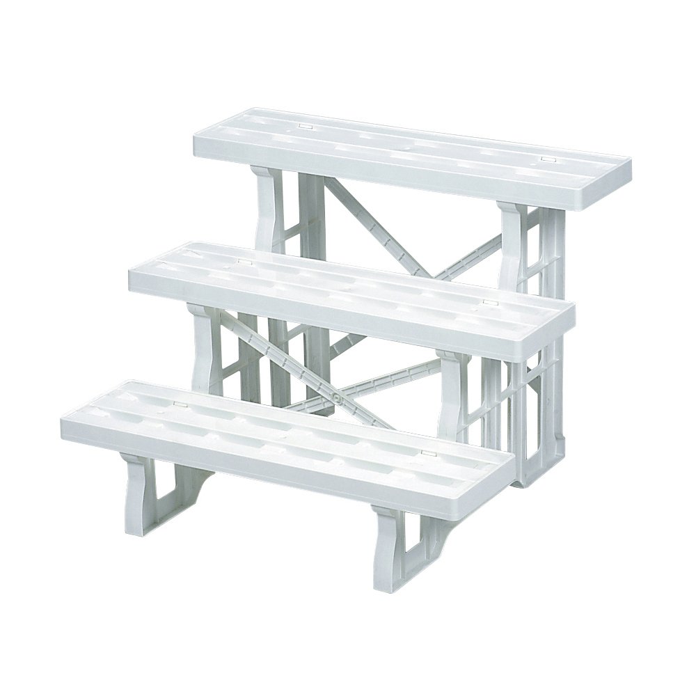 There are three rows of shelves with a width of 600 mm, four bowls (diameter about 12 cm), five bowls (diameter about 15 cm) and four bowls (diameter about 18 cm) are arranged on one shelf with three bowls
