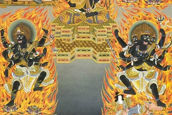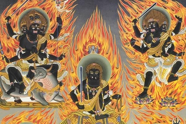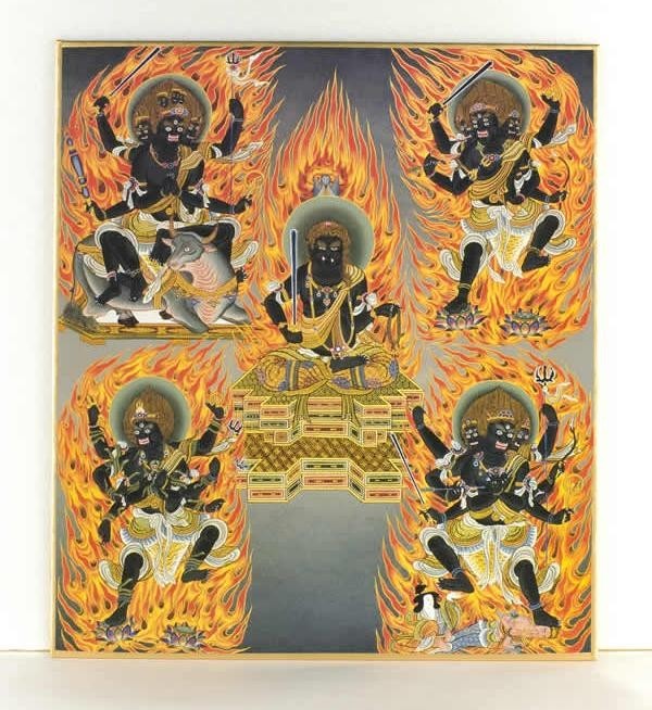 不動明王、降三世明王、軍荼利明王、大威徳明王、金剛夜叉明王の五大明王。中央と四方を守り固める完全な守護形式を有し、様々な障害を取り除く、最も強力な念怒尊といわれています。