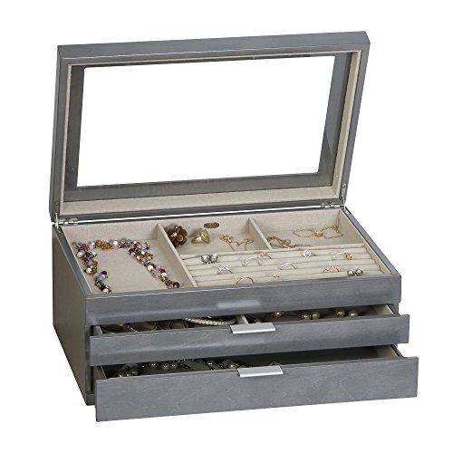-. Binding : Kitchen -. Brand : Mele & Co. -. Feature : Dimensions: 15L x 10W x 6.5H in. / Crafted of gray-finished wood / Includes 3 tiers / Linen-weave lining / Features large ring-roll section -. Label : Mele Jewel Box -. Manufacturer : Mele Jewel Box -. MPN : 00340S17 -. PackageQuantity : 1 -. PartNumber : 00340S17 -. ProductGroup : Home -. ProductTypeName : HOME -. Publisher : Mele Jewel Box -. Studio : Mele Jewel Box -. Title : Misty Glass Top Wooden Jewelry Box - 15L x 10W in.