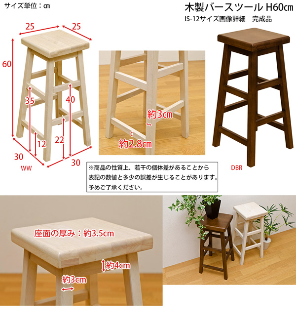 本商品はお取り寄せ商品のため、稀にご注文入れ違い等により欠品・遅延となる場合がございます。誠に恐れ入りますが、何卒ご了承ください。 また、以下の場合には追加送料がかかる場合がございます。  ・大型商品の複数購入時 ・同梱区分が異なる商品の複数購入時  【出荷目安】:1 - 4営業日 ※土日・祝除く 【同梱区分】:TS 1490 【梱包サイズ】:大型商品 【代引き決済】:不可  配送伝票の依頼主は出荷元(メーカーもしくは仕入元)名となる場合がございますので、お受け取りの際はご注意ください。   【型番】IS12  【商品名の色やサイズについて】 こちらは「木製バースツール 【1脚】 高さ60cm 天然木/木目調 ダークブラウン 【完成品】」の商品ページです。商品画像や商品情報には、色違いやサイズ違いの商品が載っている場合がございます。ご注文前に色・サイズ・セット内容のご確認をお願いいたします。  四角い座面が特徴的な木製スツールです。  脚元の補強棒が、側面によって高さが違い、ちょっとした工夫のあるデザインになっています スツールとしてはもちろん、観葉植物のディスプレイとして使ってもいいかも♪  1脚単位からのご注文可能なので、お好きな脚数をお求めいただけます。 天然木を使用していますので、しっかりとした使い心地で、温かみがあります。 シンプルなデザインなので、どんなお部屋のスタイルにも合いやすいです  ダークブラウン・ホワイトウォッシュの2色よりお選びいただけます。 ※ホワイトウォッシュは、薄白色で木目が見える色です ※天然木を使用している為、木の節・木目の色差がある場合があります(不良ではありません)  幅300×奥行300×高さ600mm(梱包サイズ:幅310×奥行310×高さ620mm) 座面サイズ:幅250×奥行250 座面の厚み・約35mm 脚の太さ:約30mm 本体重量:3.5kg(梱包重量:4.3kg) 完成品(1梱包) 天然木(ラッカー塗装)  【ご注意事項】 ※本商品は、北海道・沖縄・離島への配送はいたしかねます。あらかじめご了承ください。
