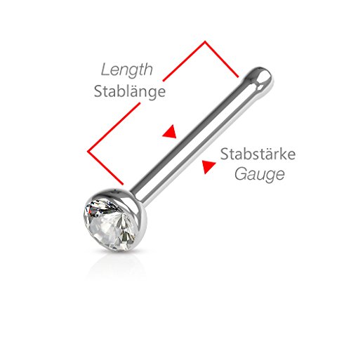 Material: 316L Chirurgenstahl; Stablange: 8 mm; Stabstarke: 0,8 mm; Schmuckstein: 2 mm; Farben: lila, blau, klar (weiss), grun, hellblau, pink, turkis, rot; Piercing fur die Nase im 8er Set; jeweils mit einem wunderschonen Schmuckstein besetzt; mit Verdickung am Ende des Stabes fur besten Tragekomfort