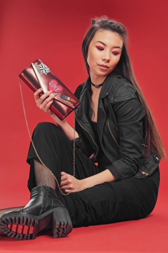 The envelope clutch boasts bright fabric appliques over a smooth surface with metallic shimmer. A foldover flap is edged with metal band. A magnetic snap closure allows to open and close your clutch smoothly and provides extra security for your belongings. The inner lining is crafted from smooth satin fabric. Inside you can also find a tiny pocket for your credit cards or an ID card.