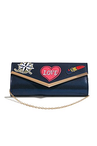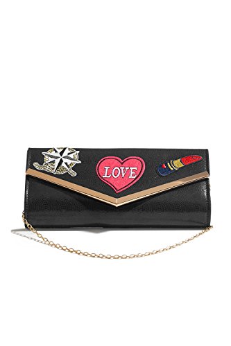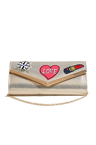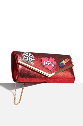 Shiny envelope clutch with fabric appliques on the flap front, a magnetic clasp, a detachable chain strap. Fully lined satin interior has a pocket for credit cards. Appropriate for parties, evenings out, casual outings.