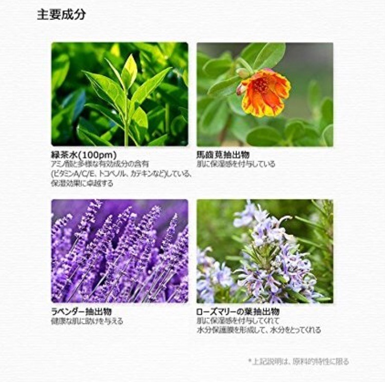主な成分:緑茶ができ(100ppm)、スベリヒユエキス、ラベンダーエキス、ローズマリー葉エキス