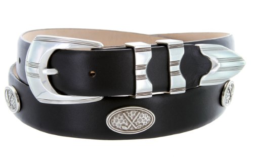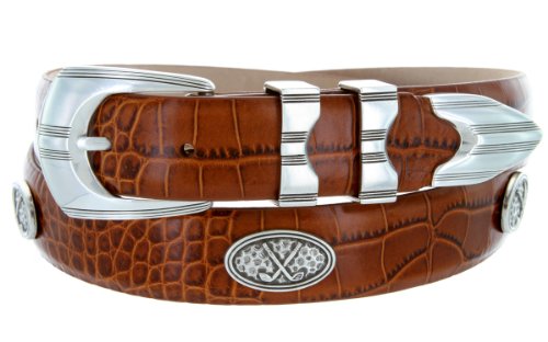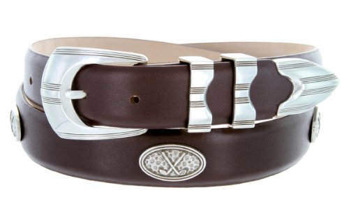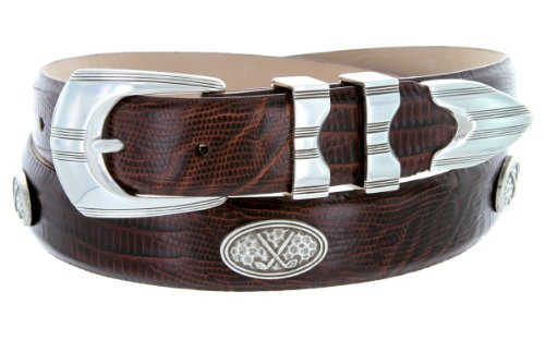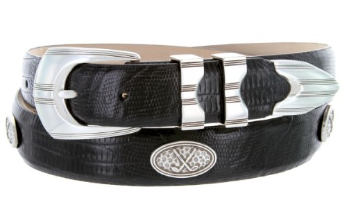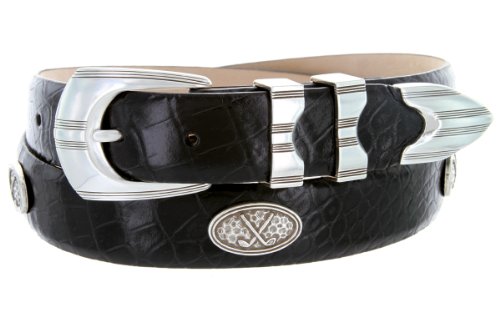 Product Description Stand out on the course with this handsome Men's golf belt. Constructed from high quality Italian Calfskin, lined with supple genuine leather on the back. This belt features an eye catching 4-piece designer buckle set, finished in antique silver. Matching golf concho ornaments complete the sporty yet dressy look. Available in a wide range of strap styles and colors. 0