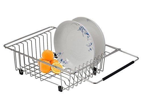 DISH DRAINER SPACE SAVER - Takes up only a little space_ saves space on the counter. Dimensions: The basket is 13``L x 9 4/5`` W x 2-1/4```` H; with handles fully extended it is 17&4/5`` Long in order to fit most sinks FUNCTIONAL DESIGN - The sides can be extended so that it may fit most sinks and they grasp onto the sink pretty firmly. Multiple functions to dry dishes_ fruit_ and vegetables. Encourage to stay on top of dish washing. Creative and useful dish rack is handy for drying dish and perfect for the few dishes that you forgot to put in the washer or the ones that are too delicate PREMIUM MATERIAL - Made of Top sturdy bold 304 Stainless Steel resists corrosion. Easy to store_ clean and simple to use SUPERIOR QUALITY - Sturdy stainless steel dish drainer secure over the sink or on countertop with extending anti-skid rubber arms and four rubber feet to protect your sink and counter perfectly WARRANTY AND 100% MONEY BACK GUARANTEE - We stand by the quality of our products. We offer a 180-Day Money Back Guarantee and a 5 Year Manufacturer``s Warranty