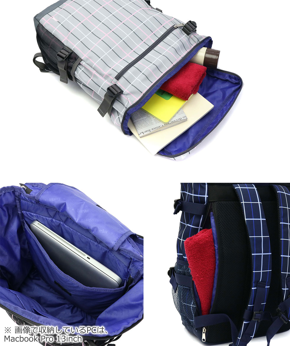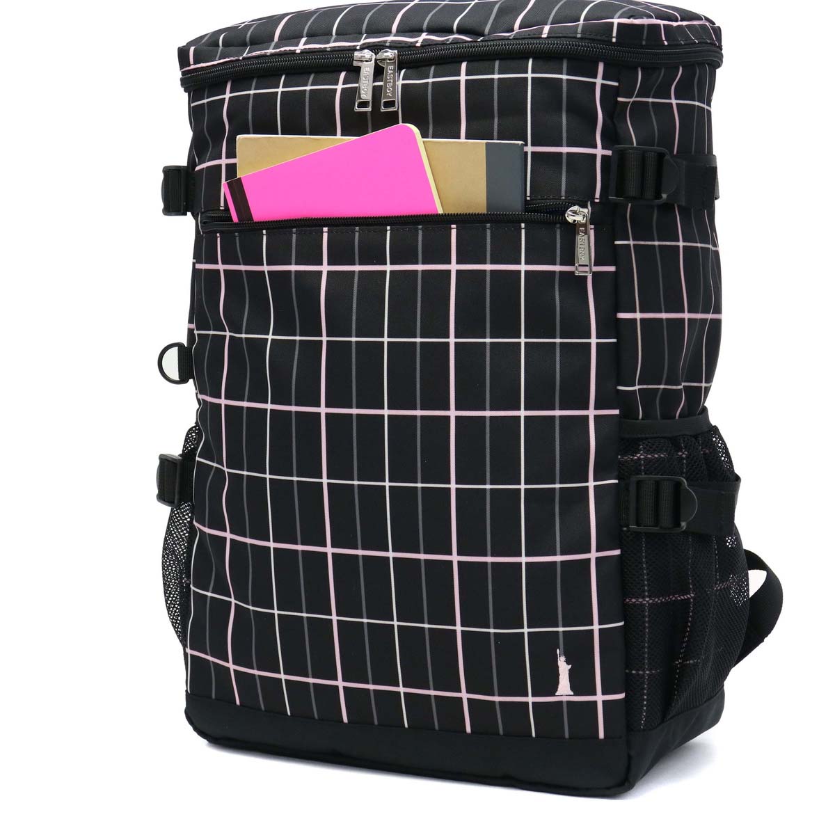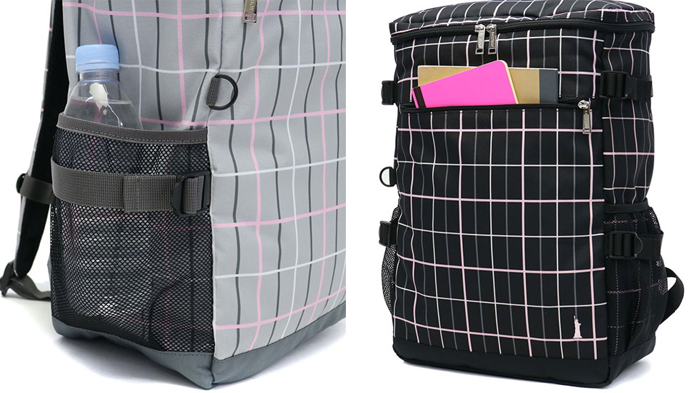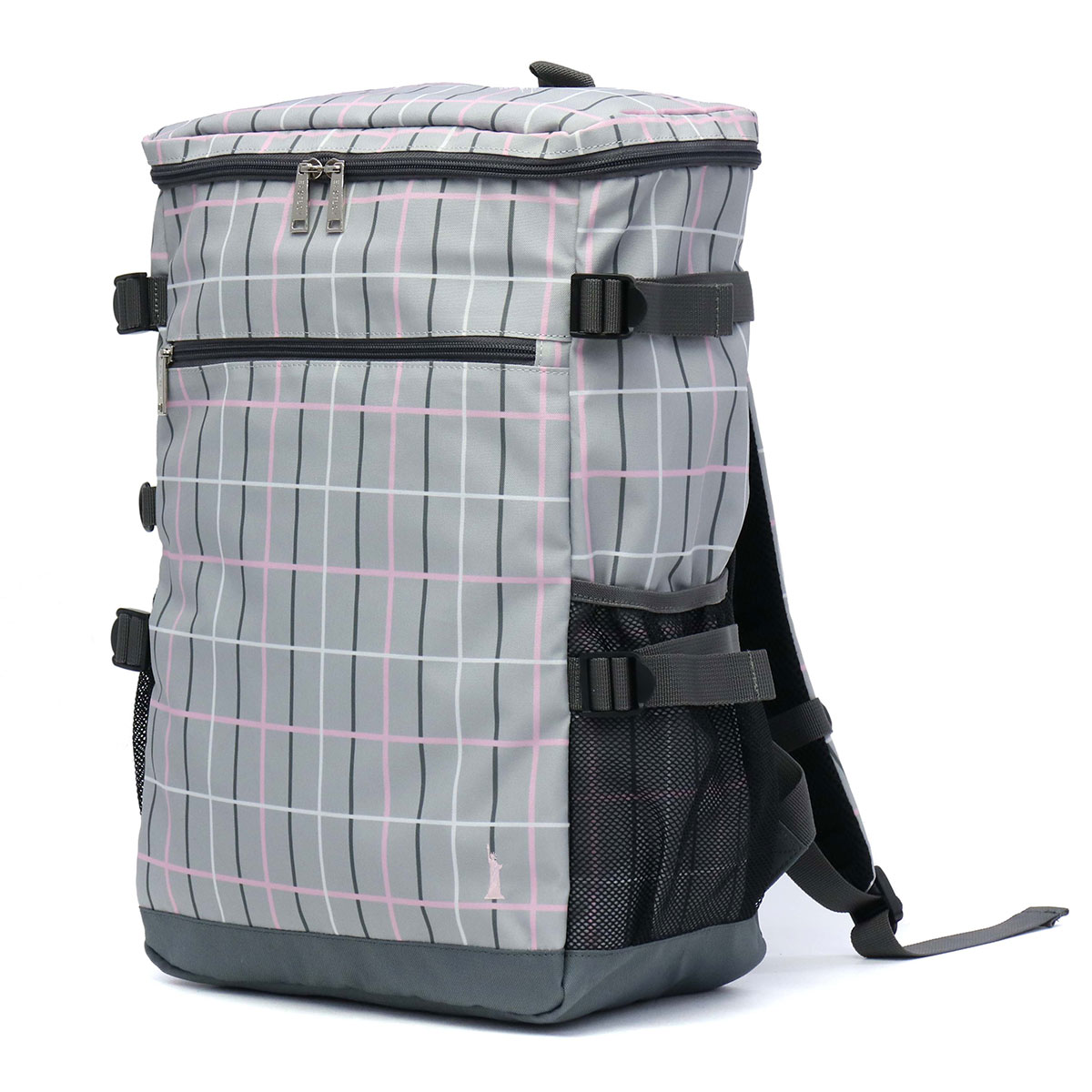 Trad base based casual brand "EAST BOY / East boy" rucksack with the Statue of Liberty as a motif. Check gray with pink or blue in the calm color ring of black · gray · navy draws cuteness.