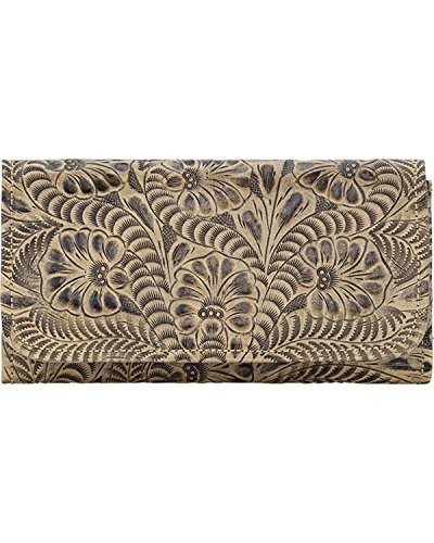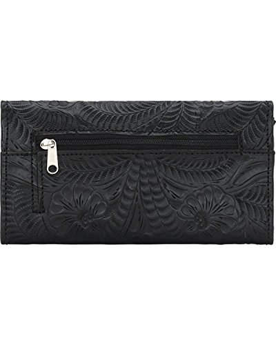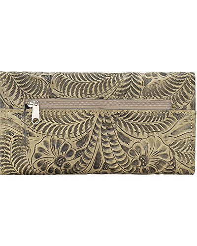 Studio : American West Publisher : American West Binding : Apparel Product Description For stylish accessories of the finest craftsmanship, cowgirls choose American West. This beautiful genuine leather tri-fold wallet is hand-stained and hand-tooled. The spring snap closure opens to ample storage space for your cash, cards, ID and checkbook. Pair it with your favorite American West handbag for the ultimate look. 0