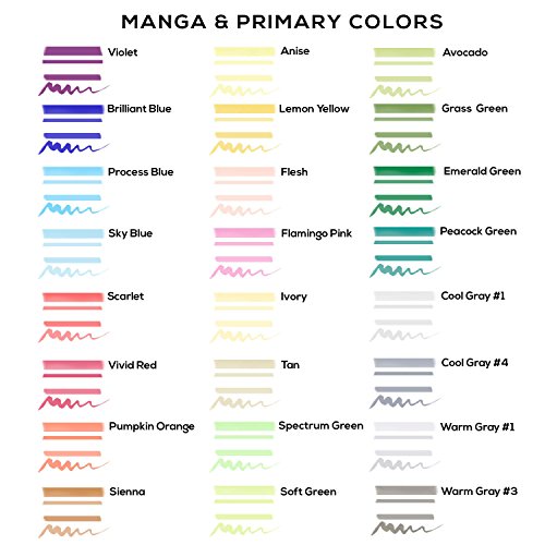 - 24 MANGA & PRIMARY COLORS: Professional superior artist quality double-ended permanent art markers. Includes all the manga & primary color shade tones artists need for drawing, sketching and illustrating realistic art like manga, comics, cartooning, anime, adult coloring books and more.