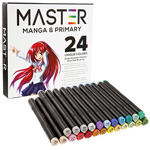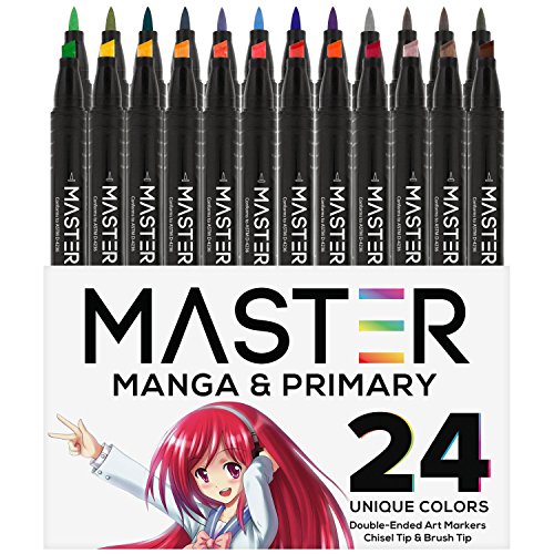 24 Color Master Markers Manga & Primary Tones Dual Tip Set - Double-Ended Art Markers with Chisel Point and Standard Brush Tip - Soft Grip Barrels - Illustration, Sketch Comics, Cartooning, Anime