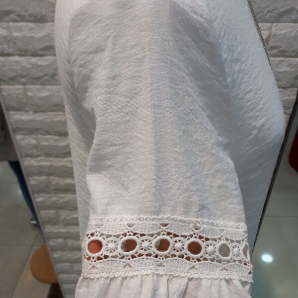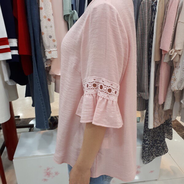 고급 레이온 원단을 80%이상 함유하여 ,착용감이 부드럽고 시원하며 여름 내내 입어도 불편함없이 데일리로 티셔츠겸 블라우스로 코디하여 활용하기에 안성맞춤 인기아이템입니다~^^자칫 밋밋할수 있는 느낌을 양쪽 소매에 자수 펀칭을 디자인으로 넣어 깔끔하면서도 더욱더 멋스러운 분위기를 연출하실수 있습니다~^^♡