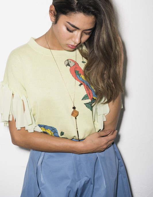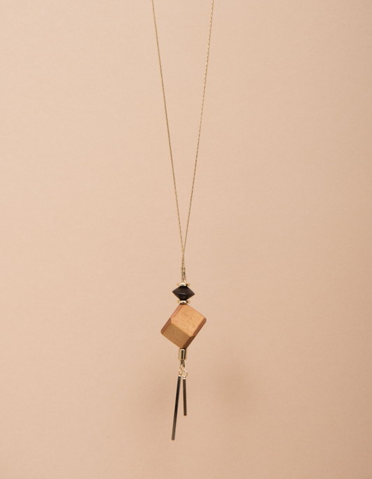 モダンクラシックなウッドパーツがスライドしてタイネックレスのような仕様のロングネックレスです。立体的なフォルムですがワンポイントとしてコーディネートしやすいアイテムです。