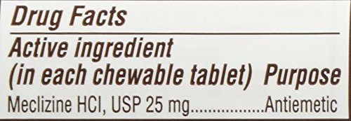 -. Binding : Health and Beauty -. Brand : Major Pharmaceuticals -. Label : Major Pharmaceuticals @ -. LegalDisclaimer : Use as directed. -. Manufacturer : Major Pharmaceuticals @ -. MPN : 300536101814 -. PartNumber : 300536101814 -. ProductGroup : Health and Beauty -. ProductTypeName : HEALTH_PERSONAL_CARE -. Publisher : Major Pharmaceuticals @ -. Studio : Major Pharmaceuticals @ -. Title : Meclizine HCL 25mg Generic For Bonine Chewable Tablets 100 ea 6 PACK