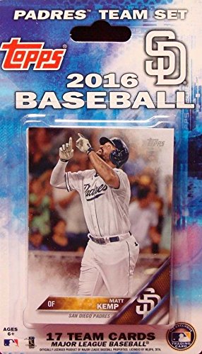 [Product Information]- This is a 2016 Topps San Diego Padres Factory sealed special edition 17 card team set; cards are numbered SDP-1 through SDP-17 and are not available in packs. Players included are Matt Kemp, James Shields, Derek Norris, Wil Myers, Alexi Amarista, Yangervis Solarte, Jon Jay, Travis Jankowski, Andrew Cashner, Colin Rea, Tyson Ross, Melvin Upton Jr., Brett Wallace, Alex Dickerson, Cory Spangenberg, Odrisamer Despaigne and Robbie Erlin.