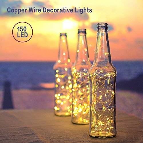 Solar Copper Wire Fairy String Lights 50ft 150LED Starry Strip Lights Waterproof IP65 Solar Christmas lights Decoration for Garden Outdoor Home Bedroom Holiday Wedding Party Warm white Rope lights