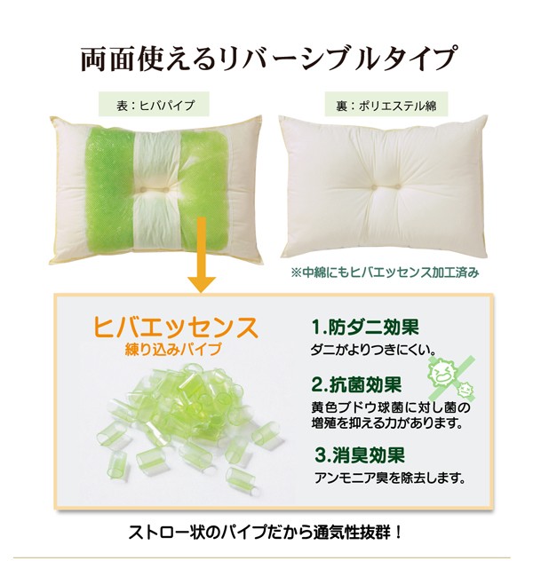 選べる高さが3種類。ご希望のサイズを選んで下さい。ヒバエッセンス練り込みパイプを使用しています。青森県のヒバの木から抽出した「ヒバエッセンス」をメーカー独自の技術でパイプに加工しました。ヒバエッセンスには、ヒノキチオールという、天然物質としては極めて抗菌性の高い成分が含まれています。(無加工品に比べ、抗菌・防臭効果があります。)ヒバエッセンスで安らかな森の眠りをご提案します。パイプ使用のため、通気性がよく、熱がこもらず心地よくご使用できます。リバーシブルタイプでひばパイプ側、ポリエステルわた側の2種類の触感を楽しめます。※中材の出し入れはできません。